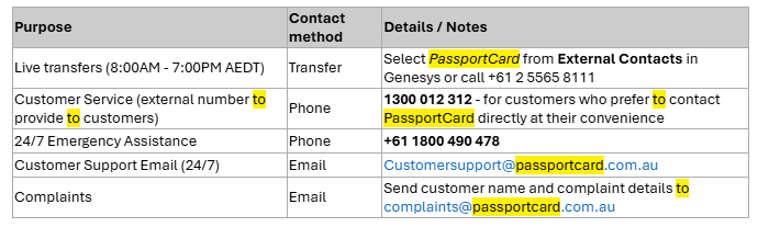 **If you speak with a customer who appears dissatisfied or wishes to lodge a complaint, please email this here with the following information, so PassportCard can prioritise follow-up: complaints@passportcard.com.au